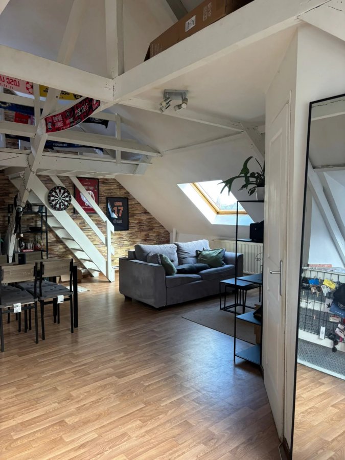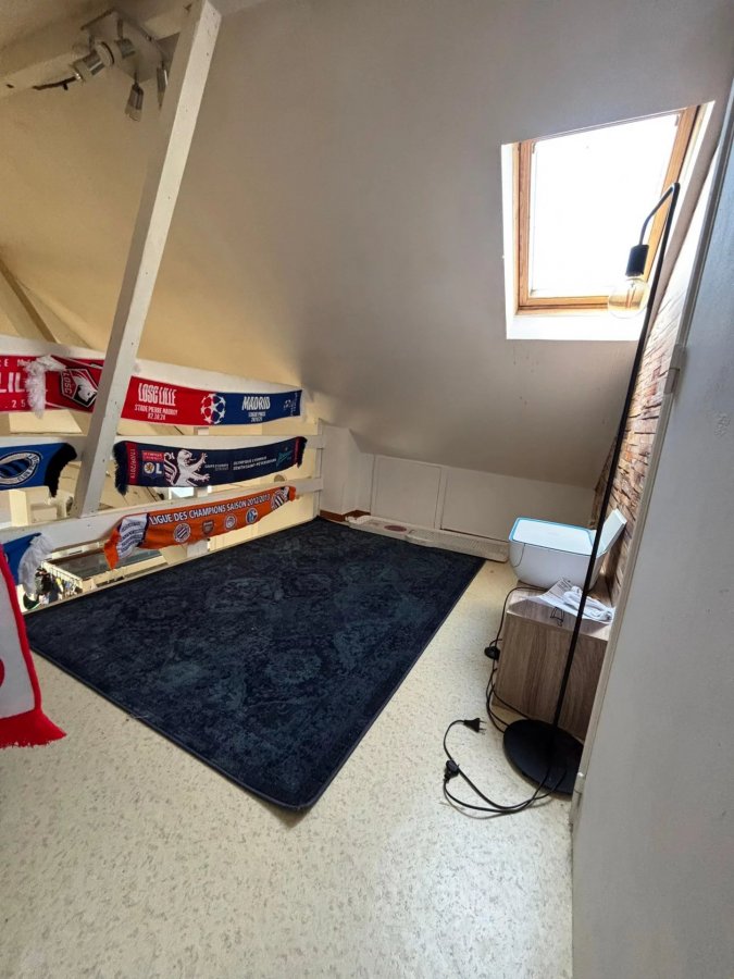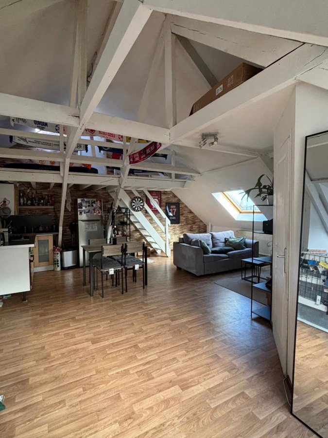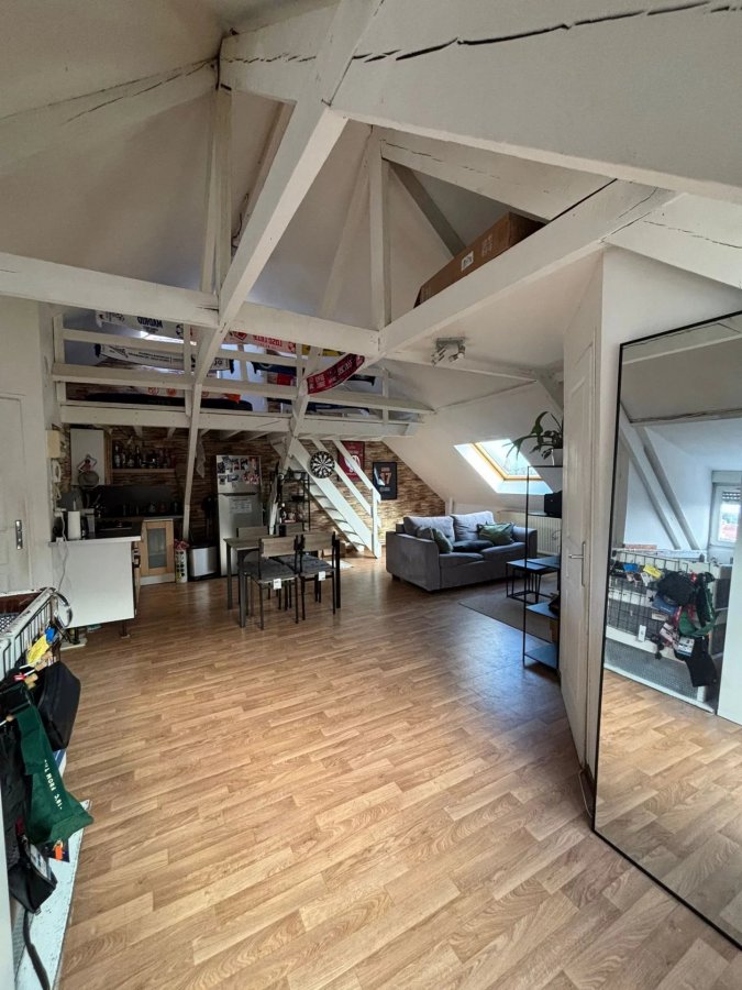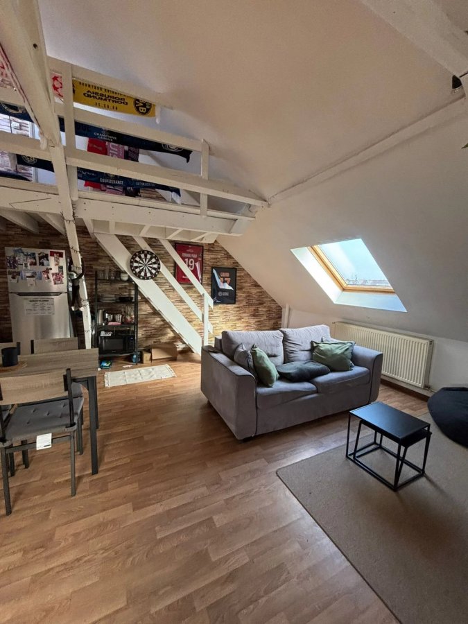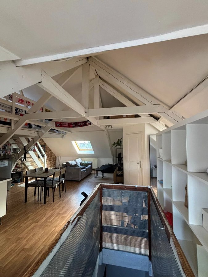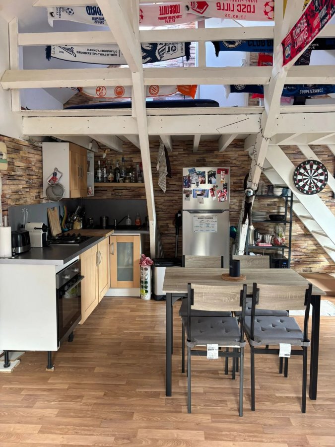 12 rue de la gare LesquinDans une petite copropriété, appartement charmant dans les toits en duplex offrant séjour/Cuisine ( four , plaques, hotte, élèments de rangement haut et bas ) chambre, et bureau.