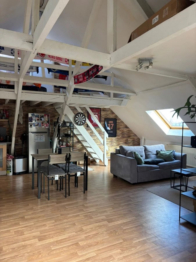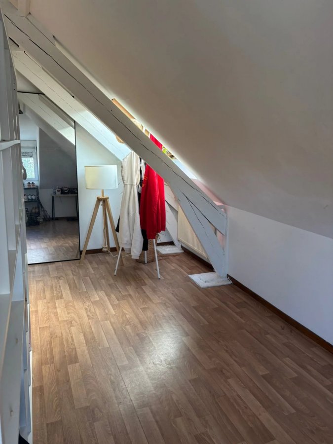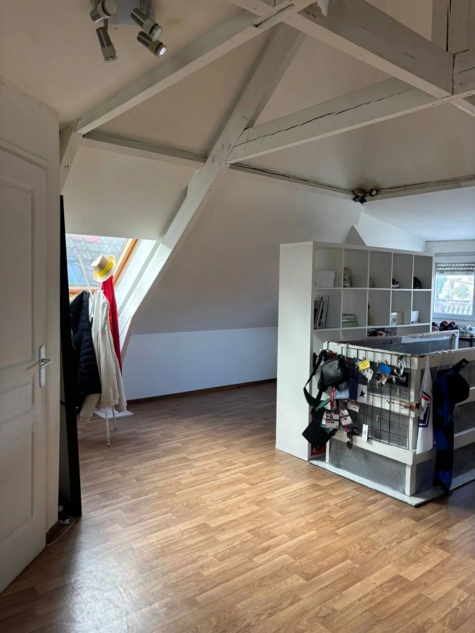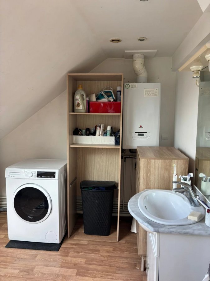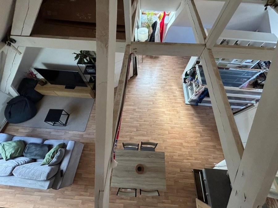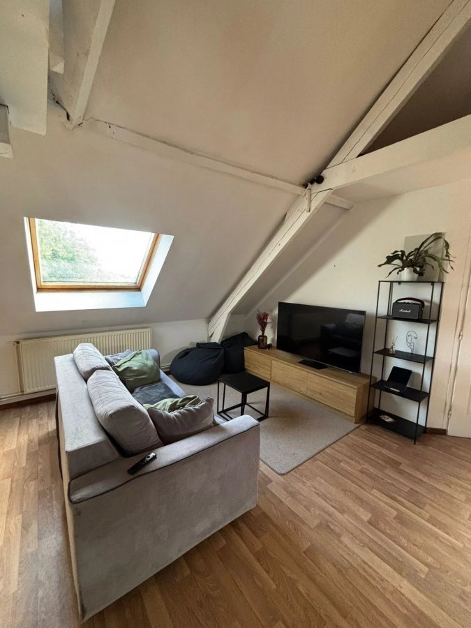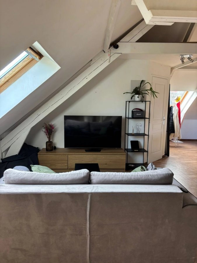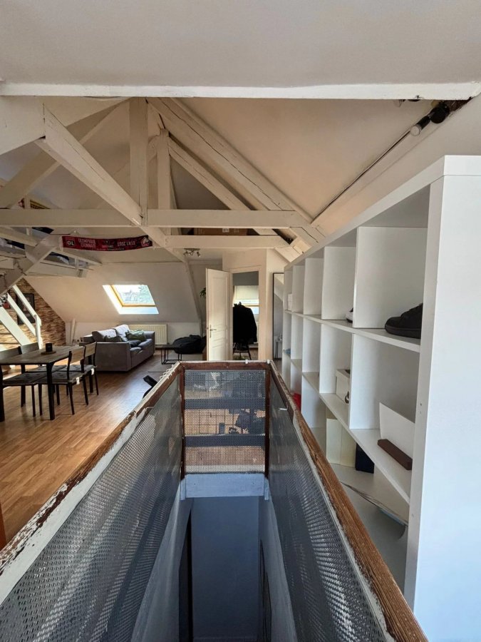 12 rue de la gare LesquinDans une petite copropriété, appartement charmant dans les toits en duplex offrant séjour/Cuisine ( four , plaques, hotte, élèments de rangement haut et bas ) chambre, et bureau.